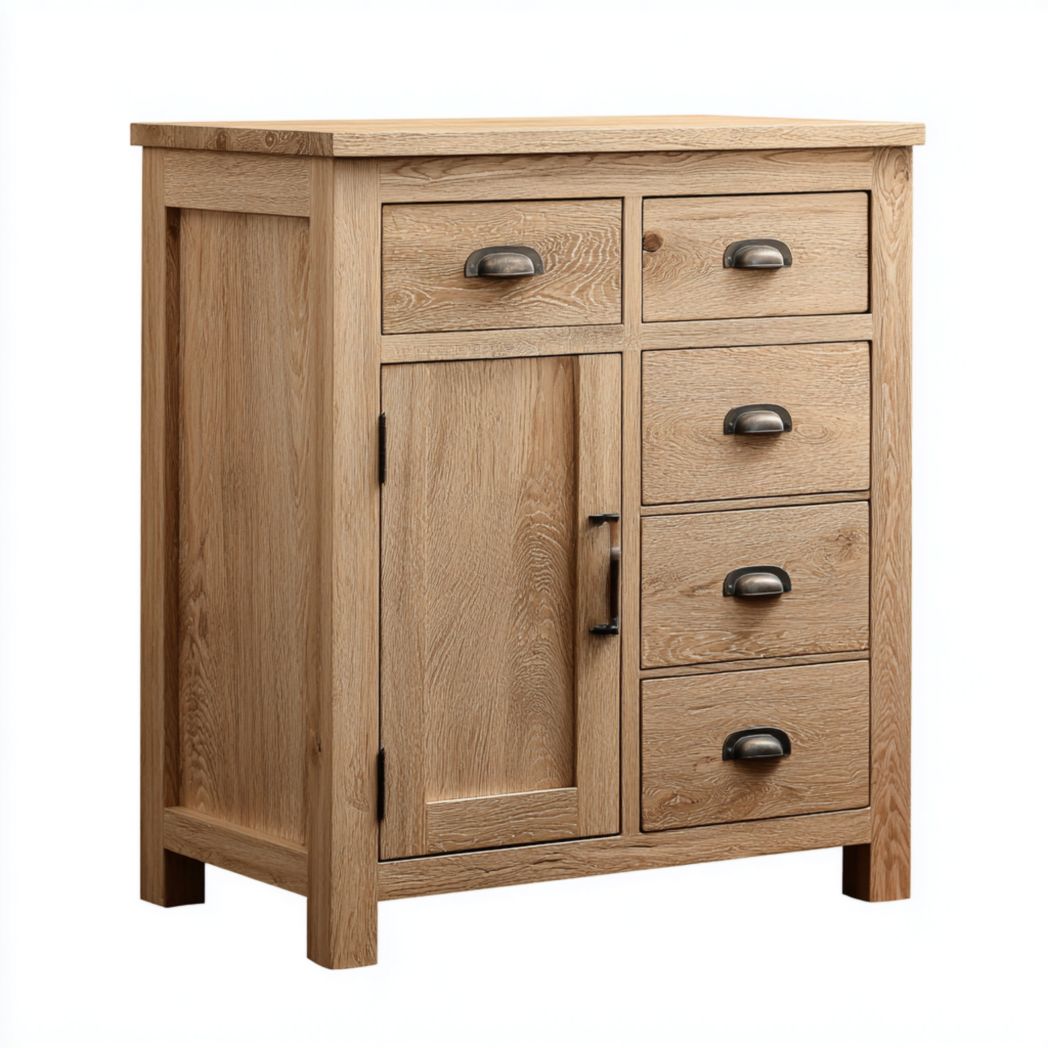 Buffet bas en chêne clair avec portes rainurées et piétement en métal noir€206,55Describe your product
