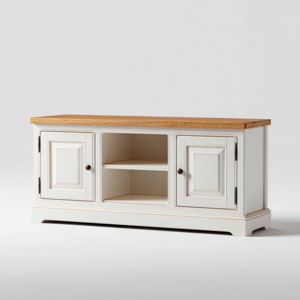 Meuble TV en bois massif blanc avec plateau en chêne et rangements