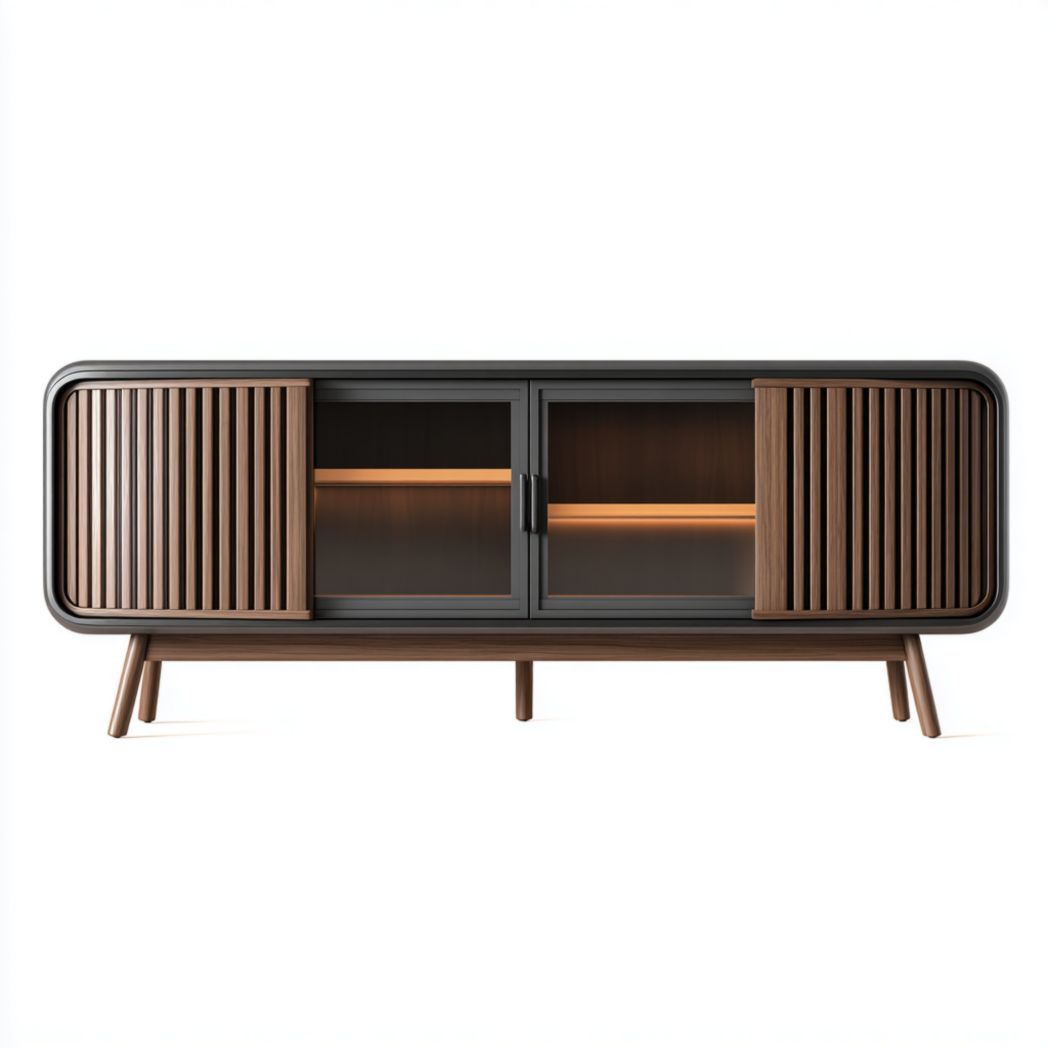 Meuble TV bas en noyer et métal noir avec portes coulissantes